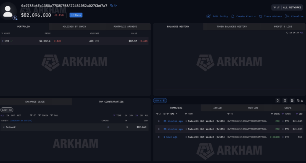 A fresh wallet has withdrawn $82.12 million worth of Ethereum (ETH) from FalconX in the past hour, according to blockchain intelligence data from Arkham . Analysts note that the purchase pattern matches previous transactions associated with Bitmine, the investment firm led by Tom Lee. The transaction involved approximately 40,000 ETH, marking another significant acquisition for the firm.