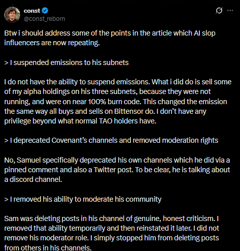 Covenant AI founder Sam Dare had accused Steeves of taking several actions against the project, including suspending emissions, restricting moderation privileges, deprecating subnet infrastructure, and applying economic pressure through token sales during operational disputes.