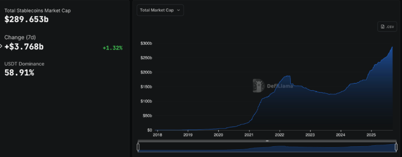 - As of mid-September, the total market capitalization stands at $289.7 billion (DefiLlama).