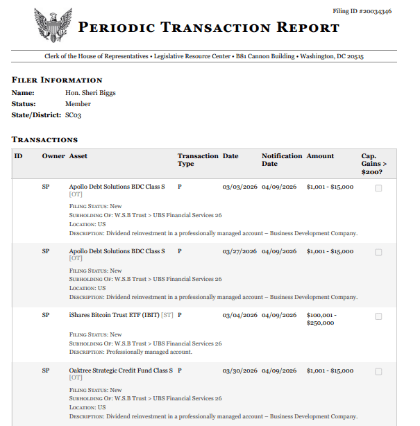 Separately, U.S. Representative Sheri Biggs disclosed a purchase of up to $250,000 in IBIT through a UBS-managed account under the W.S.B Trust. The trade, executed on March 4 and reported on April 16, falls within the STOCK Act’s 45-day reporting window and is described as professionally managed. No allegations of wrongdoing have been made.