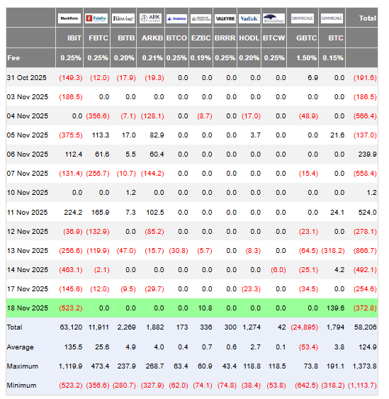 Other major products moved in the opposite direction. Franklin Templeton’s EZBC and Grayscale’s Bitcoin Mini Trust posted $10.8 million and $139.6 million in inflows, respectively. Even so, the overall ETF market ended the day with net outflows of $372.8 million, marking the fifth straight session of redemptions.