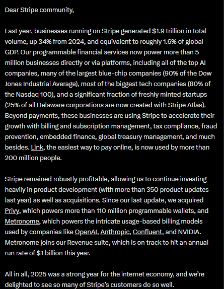 Global payments firm Stripe has signaled that blockchain infrastructure may need to scale dramatically to support the rise of artificial intelligence agents. In its latest annual outlook, co founders Patrick Collison and John Collison projected that decentralized networks could eventually require throughput exceeding one million and potentially one billion transactions per second (TPS).