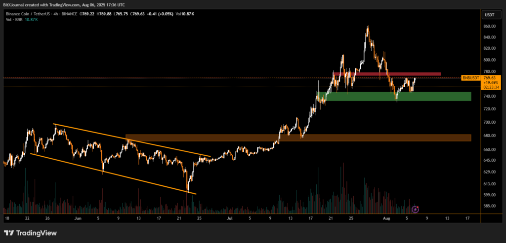 “BNB needs to reclaim the $780 level decisively to maintain bullish momentum. Otherwise, short-term consolidation remains the most probable scenario,” a derivatives trader noted.