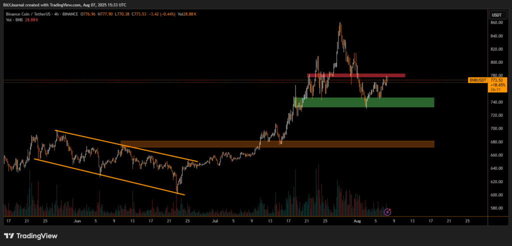 On the chart, BNB broke out of a descending wedge pattern formed between late May and early July—a historically bullish reversal signal. This breakout led to a sharp uptrend, which found temporary resistance in the $780–$790 zone, now marked as a supply area (red box). Price was rejected from this region after testing it twice, suggesting seller presence remains strong.