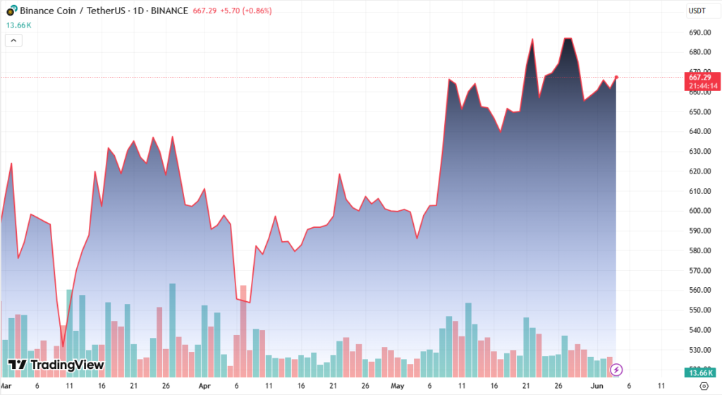 Following the announcement, BNB surged from $650.28 to $673.70, representing a 3.6% intraday increase, before pulling back to around $665. Despite the correction, BNB held above a psychologically key support level, indicating resilience.