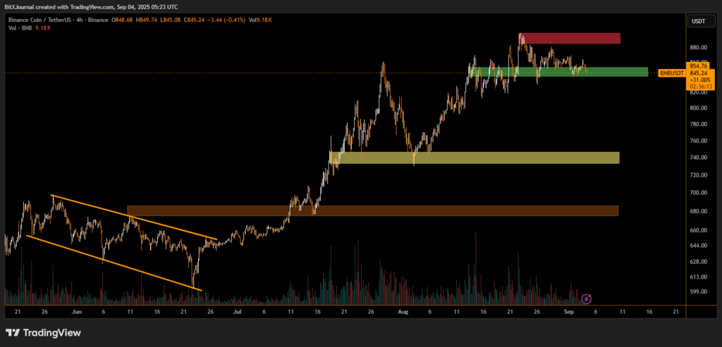 BNB has established a strong support band near $830–$845, a level that has repeatedly attracted buying interest. Below this, secondary support sits in the $740–$750 region, while a deeper pullback could revisit the $680–$690 zone, where previous consolidation occurred.