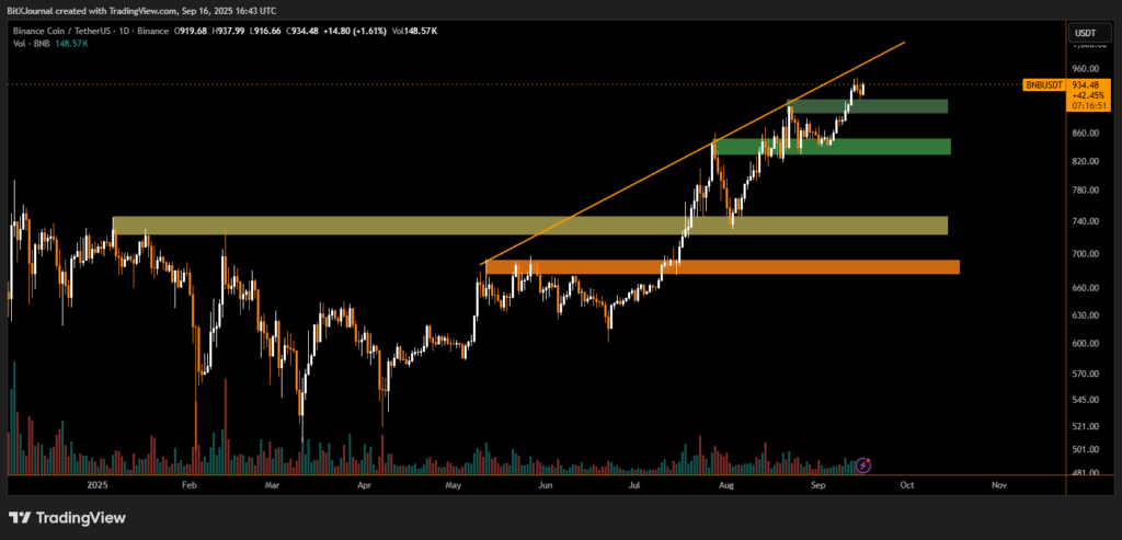 The chart highlights a series of well-defined support zones that have guided BNB’s climb. Immediate support rests around $880–$860, while a deeper cushion lies near $820. Below that, a broader base at $740–$700 reflects the consolidation range that capped much of BNB’s summer trading activity.