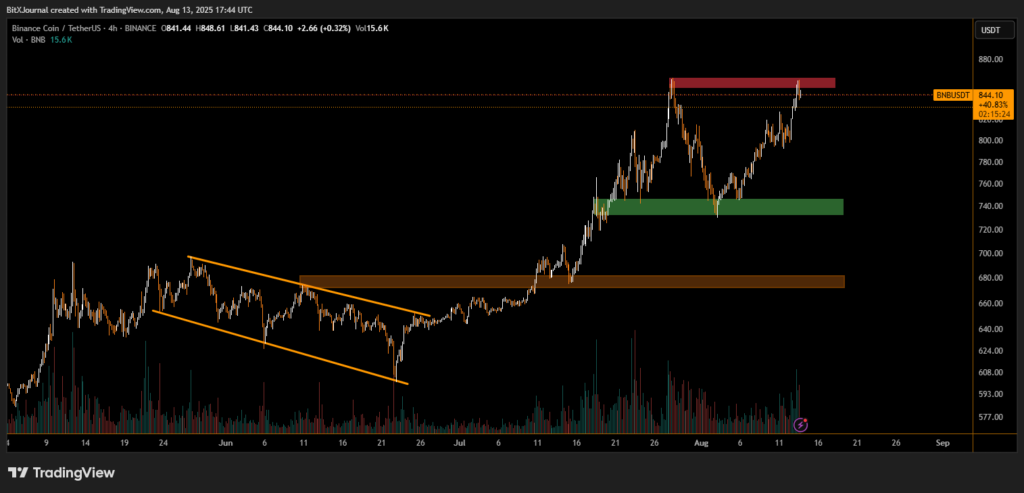 Over the past week, BNB has outperformed most major altcoins, climbing from a key support zone around $740 to current levels above $840. Technical charts show the breakout from a prolonged descending channel in June, followed by a decisive rally through the $680 resistance zone in July. This level has since turned into a strong demand area, signaling sustained bullish momentum.