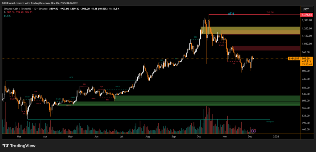 BNB is currently trading near $910, holding firmly above the recent swing low around $896. This stability comes alongside a notable 68% increase in trading volume, a sign of growing market participation at a time when the token is approaching a decisive technical zone. The uptick in activity indicates that market participants are positioning ahead of a potential shift in trend.