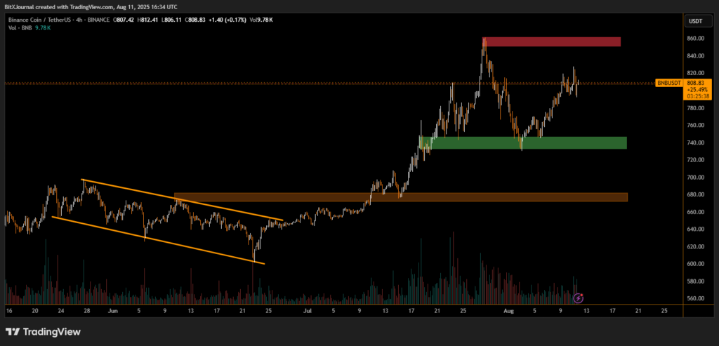 The latest advance began after BNB rebounded from the $740–$755 green support zone, an area that previously acted as a springboard in late July. This upward momentum followed a sustained breakout from a descending channel pattern observed in June, which is often seen as a reversal indicator in technical analysis.