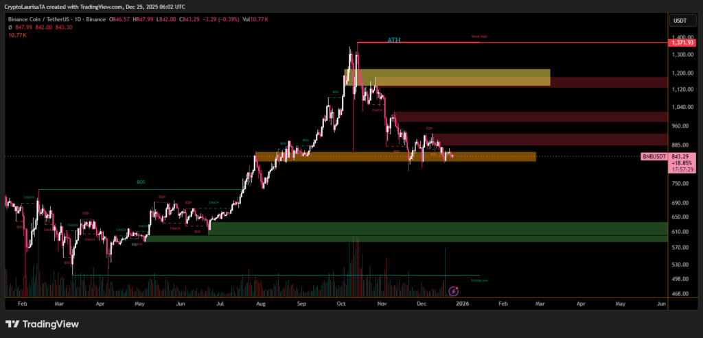 BNB is currently consolidating around a previous demand zone near the mid-$800 range, an area that previously acted as a strong base during the bullish continuation phase. This zone is critical, as a confirmed daily close below it could expose price toward the lower demand region around $600, which aligns with a historically strong accumulation area.
