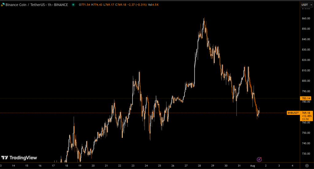 BNB slid by 4.5% in 24 hours, falling from $805 to $766, as global financial conditions pressured the broader crypto market. The decline follows renewed investor caution due to rising U.S. Treasury yields, Trump-era tariffs, and a stronger dollar.