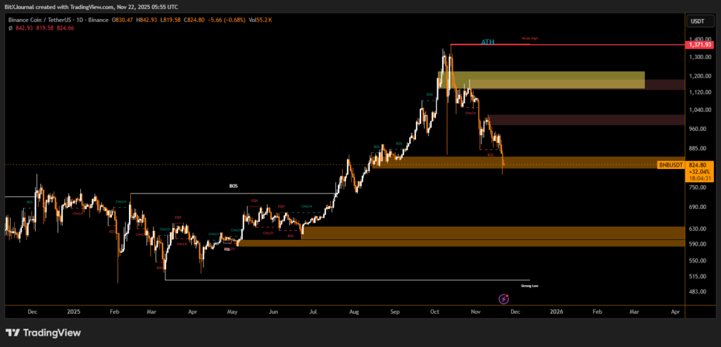 The crypto market woke up to renewed volatility this week, and Binance Coin was no exception. BNB slid roughly 6%, trading near $821.99 in the early Friday session, as traders assessed whether the token’s impressive multi-month rally has finally run out of momentum. The pullback arrives after repeated attempts to reclaim higher territory, raising questions about near-term direction.