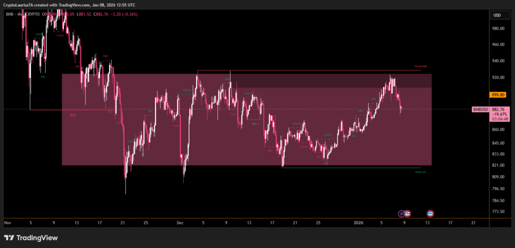 Firm resistance near $900 and declining volume suggest continued consolidation. Until BNB reclaims this level with stronger participation, price action is likely to remain range-bound and sensitive to broader market moves.