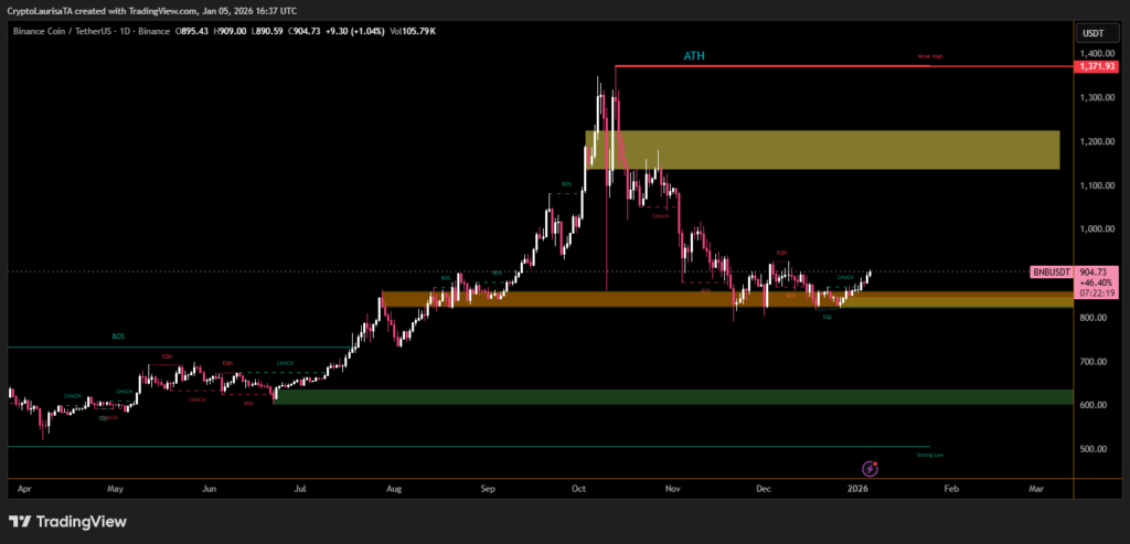 BNB is trading in a narrow consolidation range as price action shows growing compression near the $900 level. The token has edged higher in recent sessions, reflecting steady demand, but technical indicators suggest the market remains balanced rather than directional as 2026 begins.