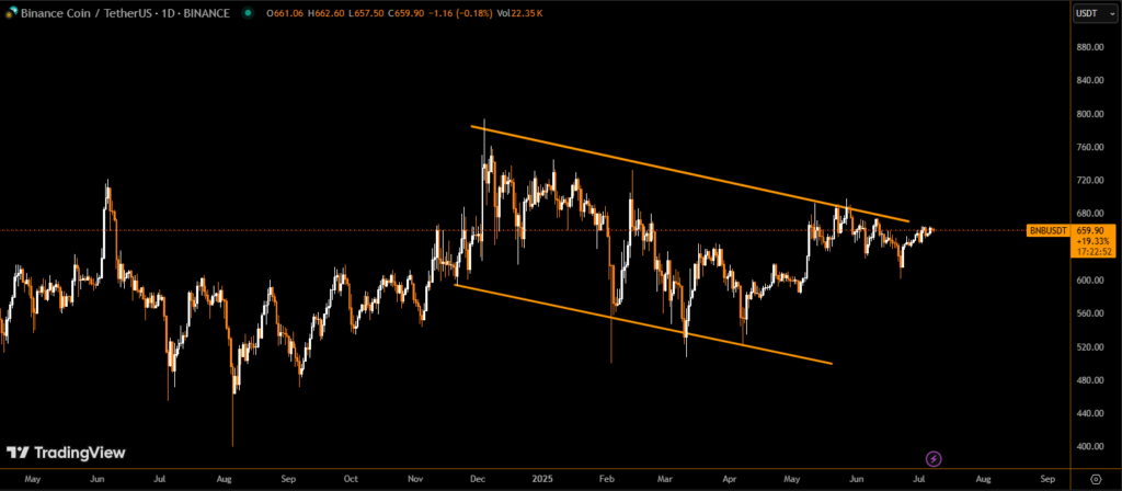 BNB remains in a state of technical consolidation, with a well-defined support and resistance structure. As long as price holds above $659.45, the token retains bullish potential. However, a confirmed breakout above $664.38 is needed to shift the short-term trend and attract new buyers.
