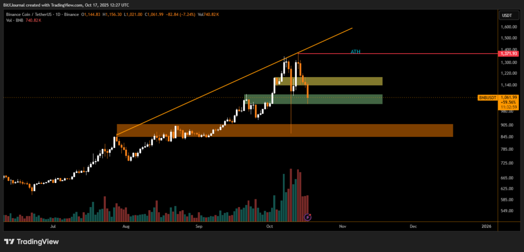 The daily chart reveals a clear break below the ascending trendline that had supported BNB’s rally since mid-summer. Price action has now moved into a critical demand zone highlighted between $1,000 and $1,050, a region that previously served as a consolidation base before the October breakout.
