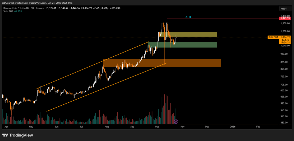 Trading volume has surged, reflecting heightened retail and institutional participation. Technical indicators point toward a continuation of the uptrend, as BNB maintains its structure within a rising channel that began in early summer. Momentum remains bullish as long as prices stay above the $1,000–$1,040 range.