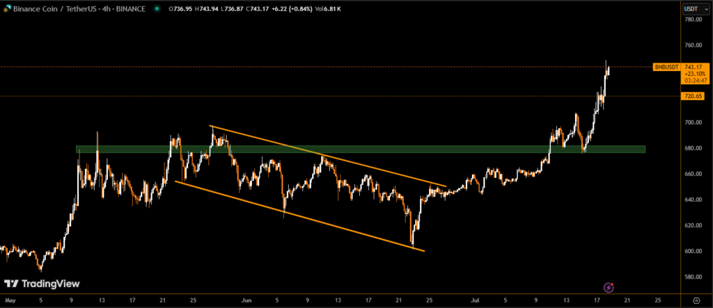 The price of BNB has climbed steadily over the past few days, breaking through a crucial resistance zone to briefly top $748, before consolidating just below $740. This recent surge reflects strong investor confidence as broader crypto market capitalization exceeds $4 trillion for the first time.