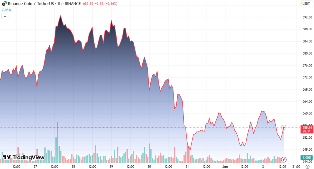 On June 1, BNB surged past $650 with high volume, reaching an intraday high near $664. This move was driven by bullish momentum, but selling pressure emerged around $662–$664, halting further gains. Since then, BNB has consolidated in a narrow range, suggesting the formation of a short-term bearish descending channel.
