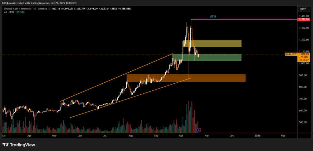 Binance Coin (BNB), the native token of the world’s largest cryptocurrency exchange, has experienced a notable pullback to around $1,050, cooling off after an impressive multi-week rally that took it close to its all-time high (ATH) of $1,371. Despite the short-term weakness, technical charts indicate potential stabilization near crucial support levels that could define the next directional move.