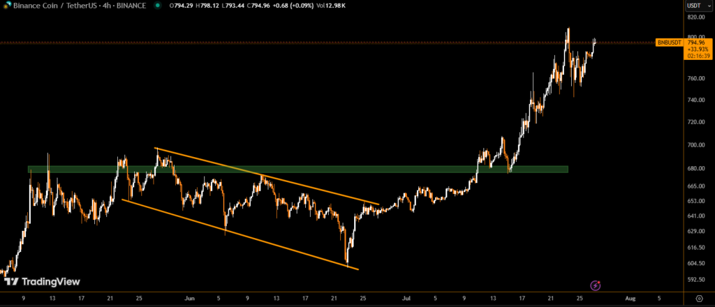 BNB has staged a strong comeback, rebounding from a brief correction to trade near $780, following a major institutional investment from biotech firm Windtree Therapeutics.