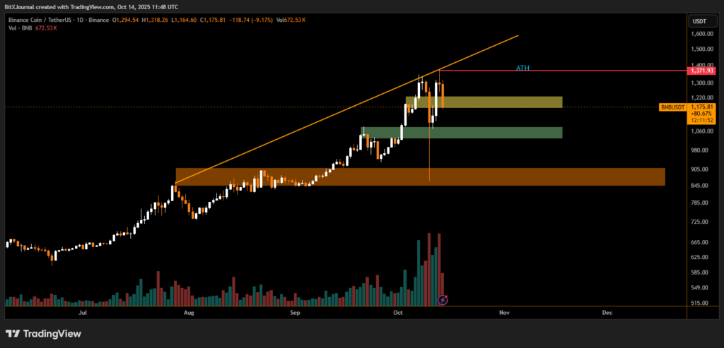 Binance Coin (BNB) has pulled back sharply from its recent all-time high (ATH) near $1,371, retracing 12% as traders locked in profits after a month-long surge. The correction follows one of BNB’s strongest rallies of 2025, during which the token gained nearly 80% in under four weeks before encountering resistance at the upper trendline.