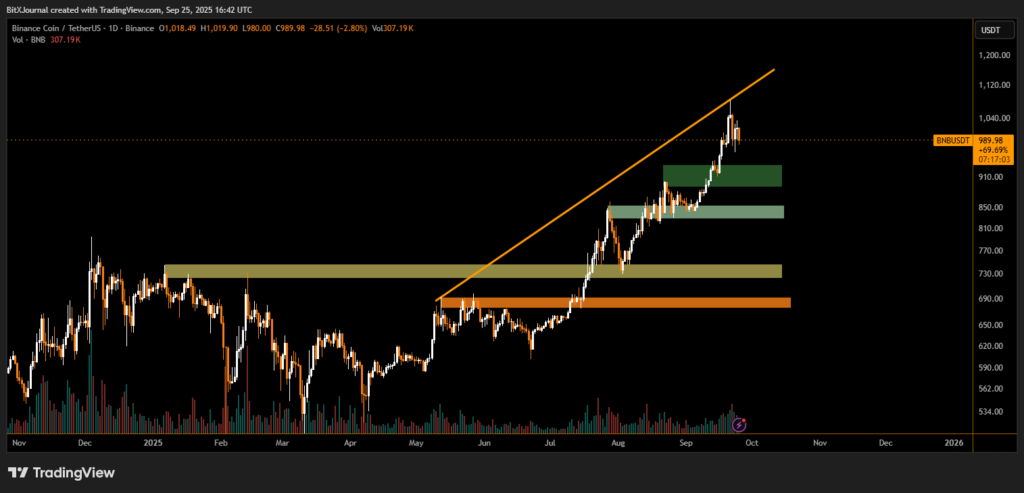 The daily chart shows that BNB recently broke its parabolic uptrend, retreating after testing highs above $1,020. The sharp move upward since July was supported by strong volume and consistent higher lows, but sellers are now defending the $1,000 resistance level.