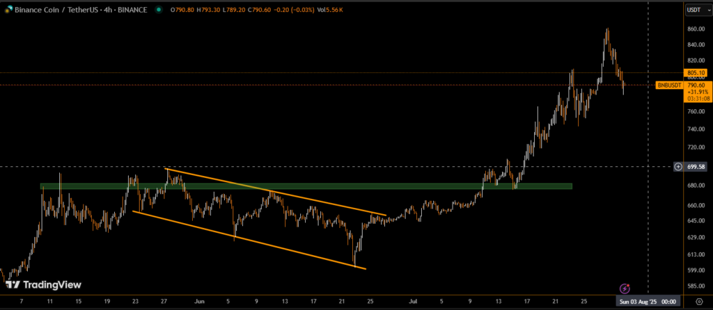 • BNB dropped 1.7% in 24 hours, falling from $815 to $795 and briefly dipping to $780 before a minor recovery.