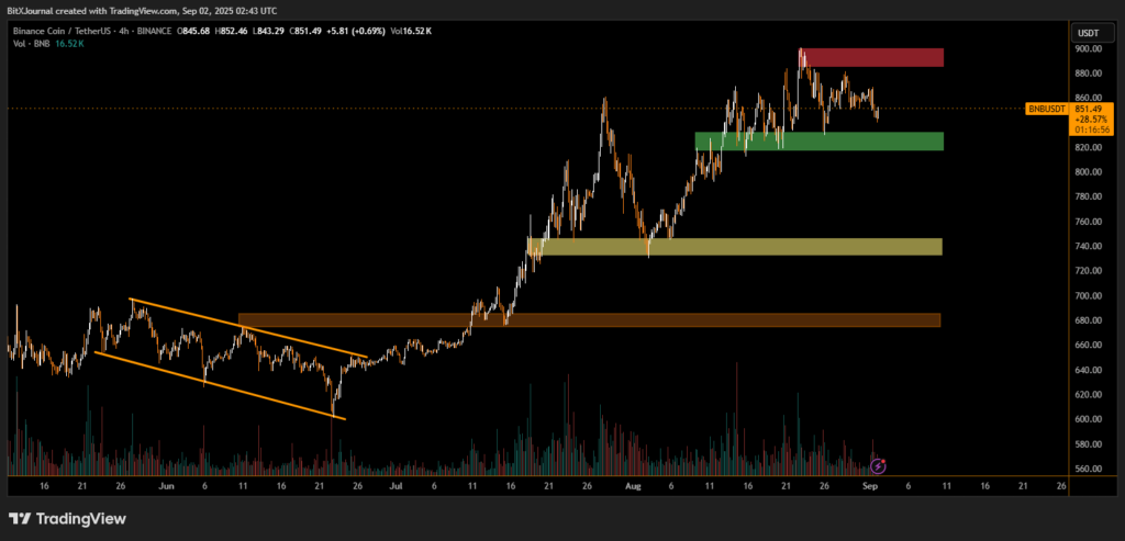 The chart shows BNB’s strong recovery since late June, when the token broke out of a falling channel near $600. From there, buyers drove a rally to nearly $900, marking a multi-month high.