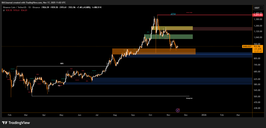 BNB trading below $1,000 underscores a shift toward uncertainty as the token approaches major support zones. The unfolding price action will reveal whether buyers can defend these regions or if the market will continue its corrective movement toward deeper daily demand levels. The coming days will be critical as structure-based signals continue to guide trader sentiment.