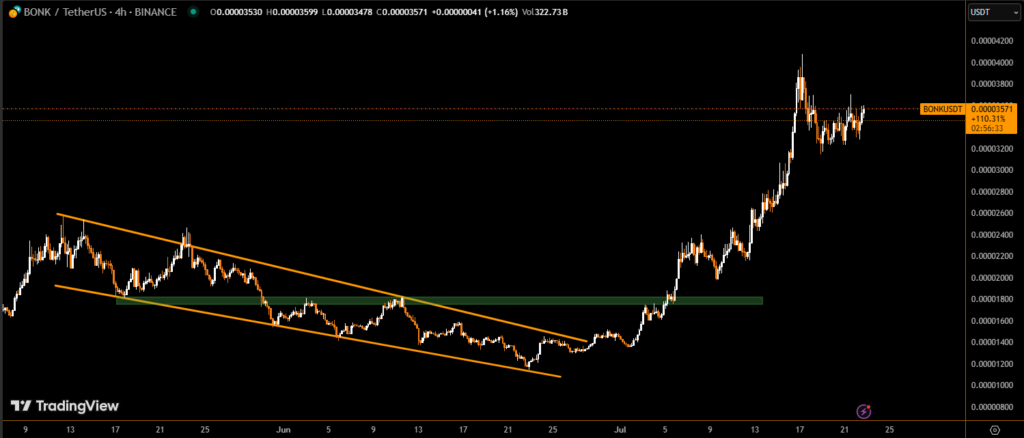 BONK, the popular Solana-based memecoin, faced heightened volatility between July 21 and July 22, registering a price range between $0.0000328 and $0.0000358 — an 8% intraday swing. Despite closing the 24-hour period down by 4%, BONK showed notable strength by defending the critical support level at $0.000033, backed by surging trading volume.