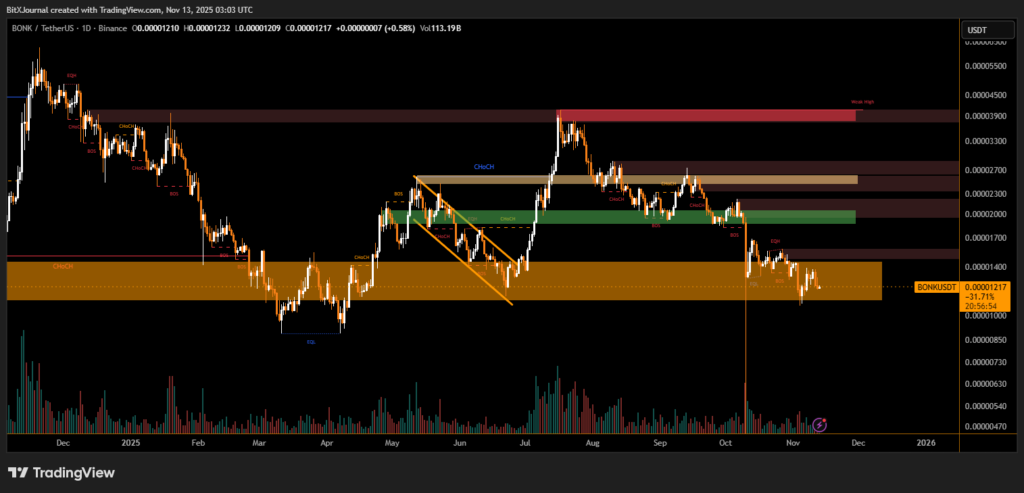 The daily chart shows BONK struggling to sustain momentum above the mid-range consolidation zone. The asset has been repeatedly rejected from the supply area between $0.0000128 and $0.0000132, confirming this level as a strong barrier for buyers.