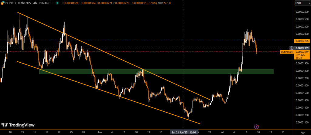 - BONK fell 6% to $0.00002161 following major sell volume.