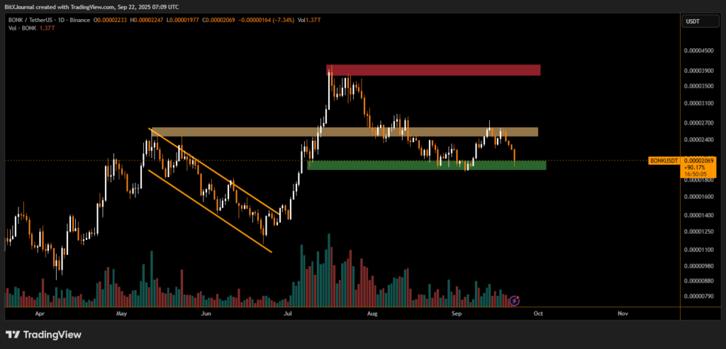 On the daily chart, BONK shows signs of consolidation after its sharp pullback from the $0.0000300–$0.0000320 resistance area. The green zone near $0.0000185–$0.0000200 has repeatedly acted as a floor, preventing deeper declines since early August.