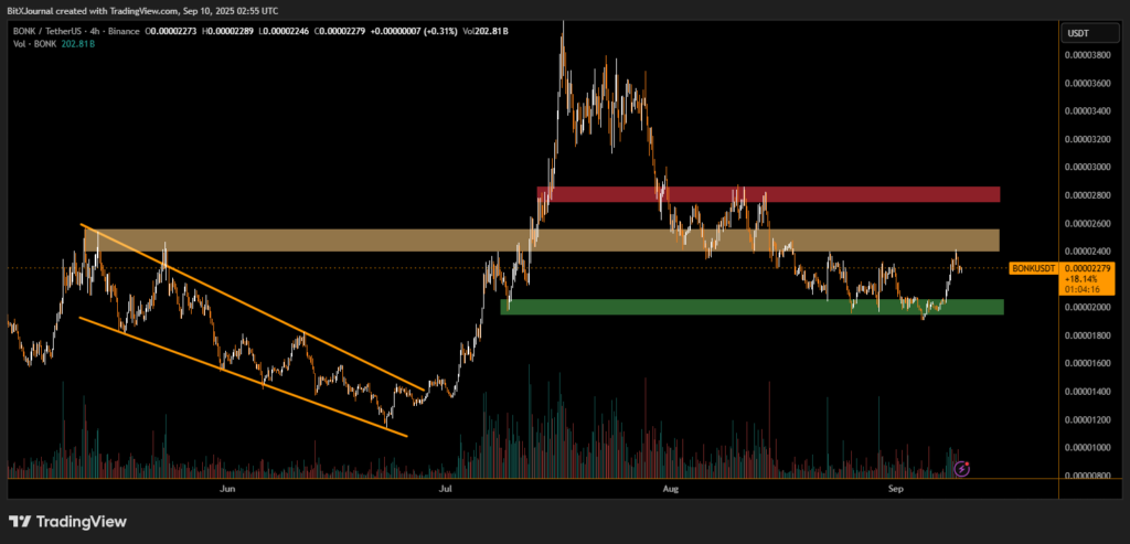 According to the 4-hour chart, BONK recently bounced strongly from the green support zone near $0.00002000, signaling buyer interest at lower levels. The price is now approaching the first major resistance band between $0.00002400 and $0.00002600 (highlighted in beige). A decisive close above this range could pave the way toward the red resistance zone near $0.00002800, last tested in mid-August.