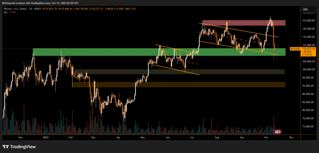 Bitcoin is currently hovering around the critical $110,000 support zone, testing one of its most important technical levels after a steep sell-off earlier this week. The correction follows a rejection from the $124,000 resistance region, leaving traders debating whether the move marks the start of a broader downtrend or a temporary pullback in an extended bullish cycle.