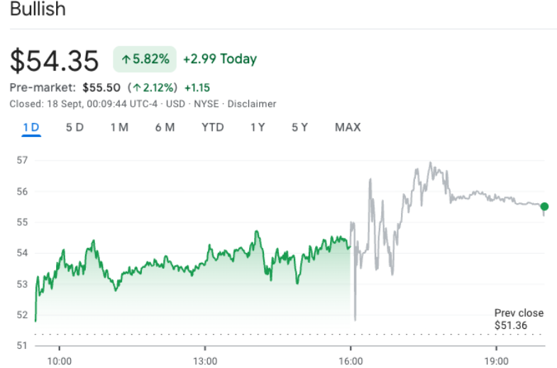 Despite being down more than 20% from its debut close of $68 in August, Bullish remains up 47% from its $37 IPO price, reflecting continued investor interest.