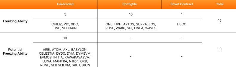 The study also highlighted 19 additional blockchains, particularly within the Cosmos ecosystem, that could easily implement freezing features through minor protocol changes.