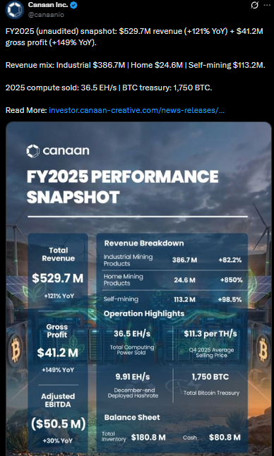 Crypto mining firm Canaan saw its shares slide nearly 7% on Tuesday, even after posting its strongest quarterly revenue in three years. The company reported fourth-quarter revenue of $196.3 million, marking a 121.1% year-over-year increase driven by higher hardware sales and improved mining performance.