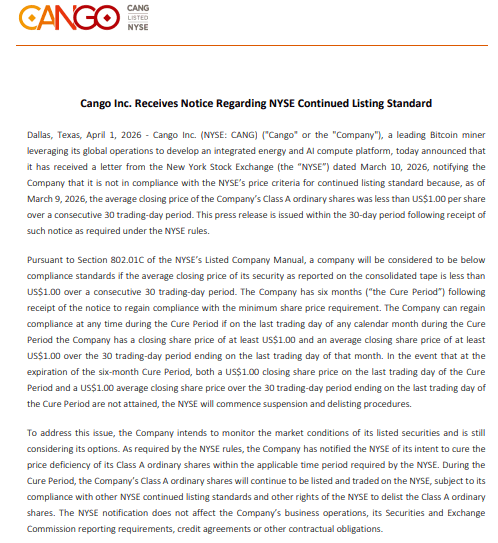 Bitcoin mining firm Cango Inc. has received a formal warning from the New York Stock Exchange after its share price remained below the required $1.00 threshold. The exchange issued the notice on March 10, stating that the company has six months to restore compliance by achieving both a closing price and a 30-day average of at least $1.00 per share.