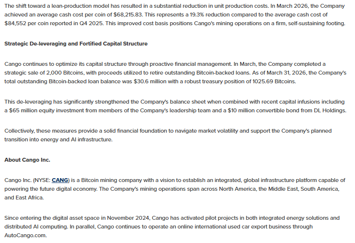 Cango sold 2,000 BTC in March at an average price of $68,000–$69,000, generating approximately $137 million. The proceeds were used to reduce outstanding Bitcoin-backed loans, which stood at $30.6 million as of March 31. The company now holds 1,025.69 BTC in its treasury.