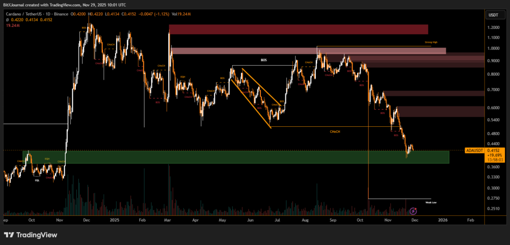 Recent price action shows a series of lower highs and consecutive break-of-structure (BOS) moves, indicating sustained bearish control. On the daily chart, ADA has repeatedly failed to reclaim supply zones between $0.55 and $0.70, reinforcing the broader downtrend.