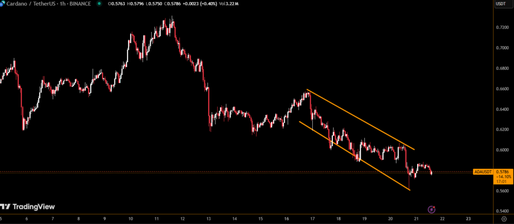 ADA reached an intraday low of $0.562 before rebounding slightly, trading between $0.582 and $0.588 in a consolidating range.
