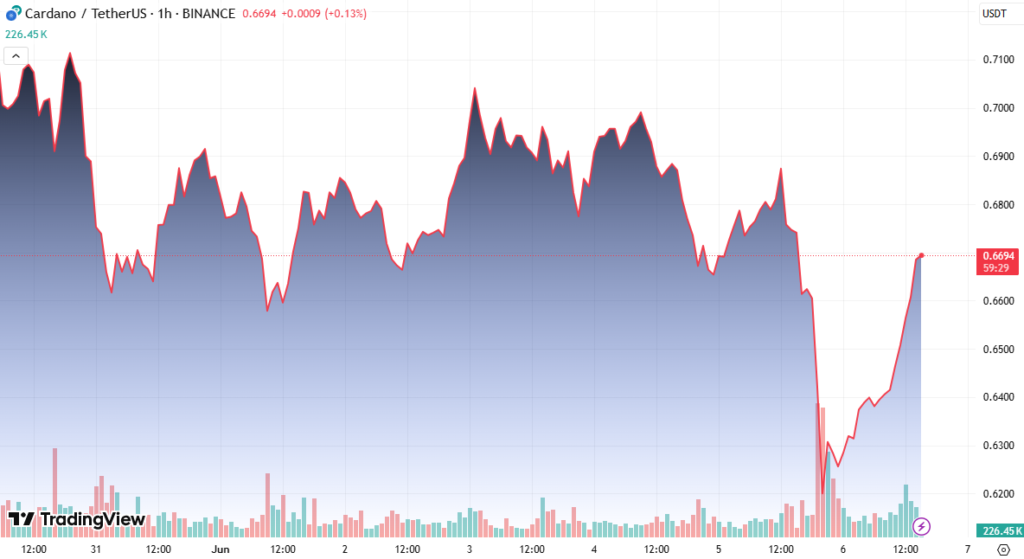 At the time of writing, ADA is trading at $0.665, down approximately 1.8% in the last 24 hours, while the broader market indicator fell by 1%.