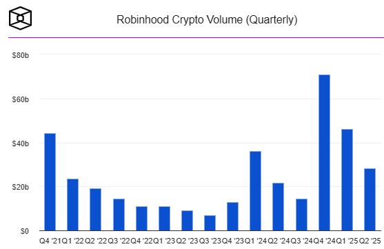 According to The Block’s data dashboard, Robinhood Crypto reported $28.3 billion in trading volume in Q2 2025 — a 24% year-over-year increase.