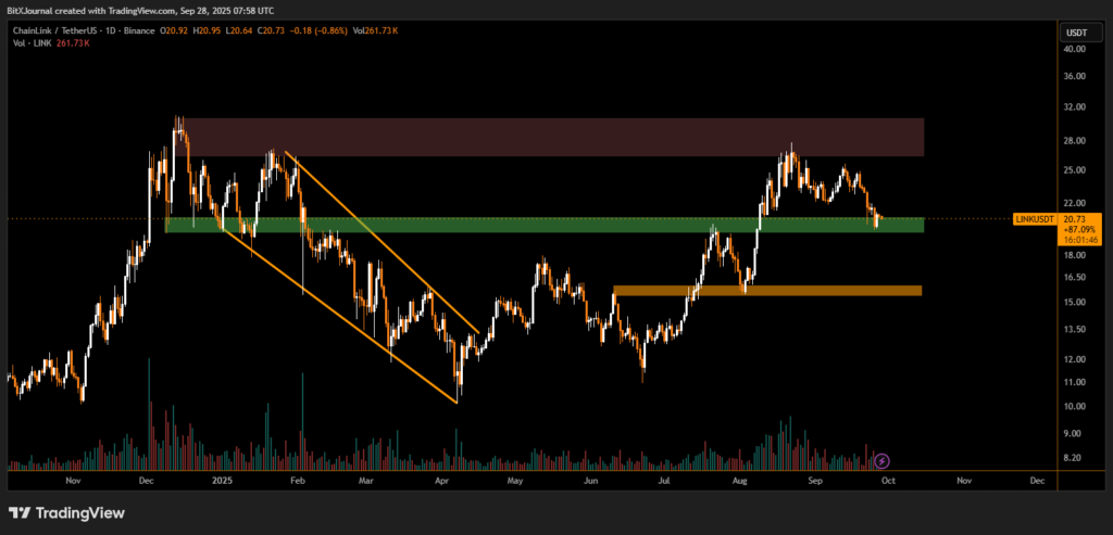 LINK recently retested the $20–$21 green support zone, a level that has historically acted as a strong demand area. Traders note that maintaining this range could open the door to higher targets. On the upside, the immediate resistance sits near $22.50, with a stronger barrier at $28–$30, where sellers previously dominated.