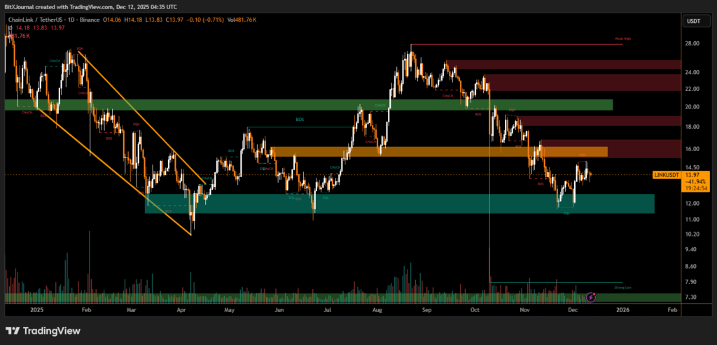 The recent reveal that Coinbase integrated Chainlink services into its multi-billion dollar bridging upgrade introduced a strong fundamental catalyst. However, broader risk-off sentiment across the crypto market overshadowed the announcement, pushing LINK lower. The token retreated into a well-defined daily demand zone near the 12–13 USDT range, an area that previously triggered strong upside reactions.