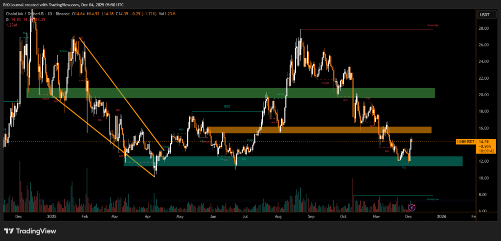 The markket data shows LINK rebounding sharply from a key demand zone near $12, an area that previously acted as a structural support level. This rebound aligns with the ETF catalyst, indicating that institutional demand may have amplified an already developing technical reversal. The strong wick rejection from the lower boundary emphasizes where aggressive buyers stepped in.