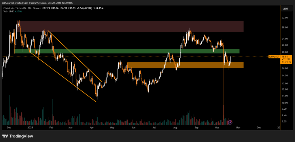 Technical charts show LINKUSD rebounding from a strong support zone between $16 and $17, marked in orange, where price previously consolidated before the August breakout. The sharp bounce has pushed the token back toward the $19 level, with traders now eyeing the next resistance zone near $21–$22 (green zone).